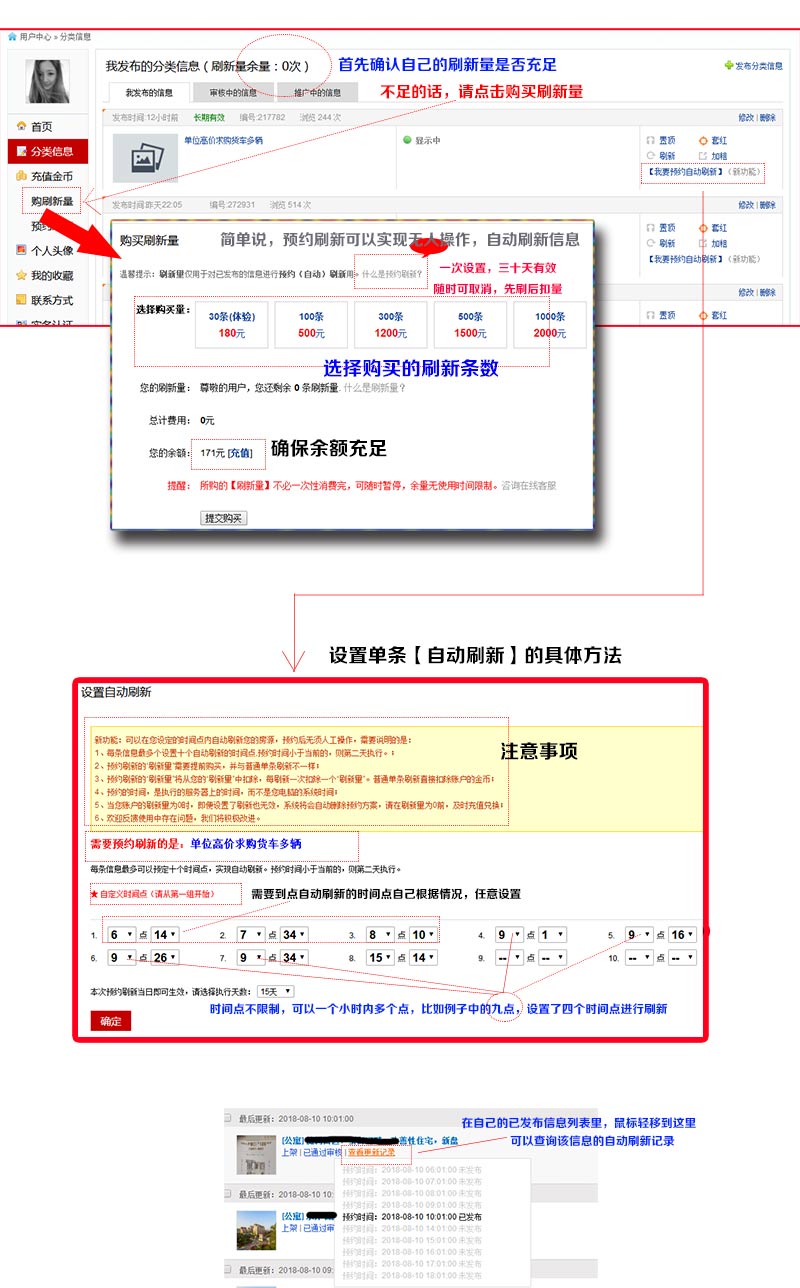 比如說,如果您想把自己發(fā)布的房源信息,在一個周內(nèi)每天的八點 九點 十點 十三點 十五點 二十點...等時間段內(nèi)自動發(fā)布,那么可以選擇預(yù)約刷新服務(wù)。